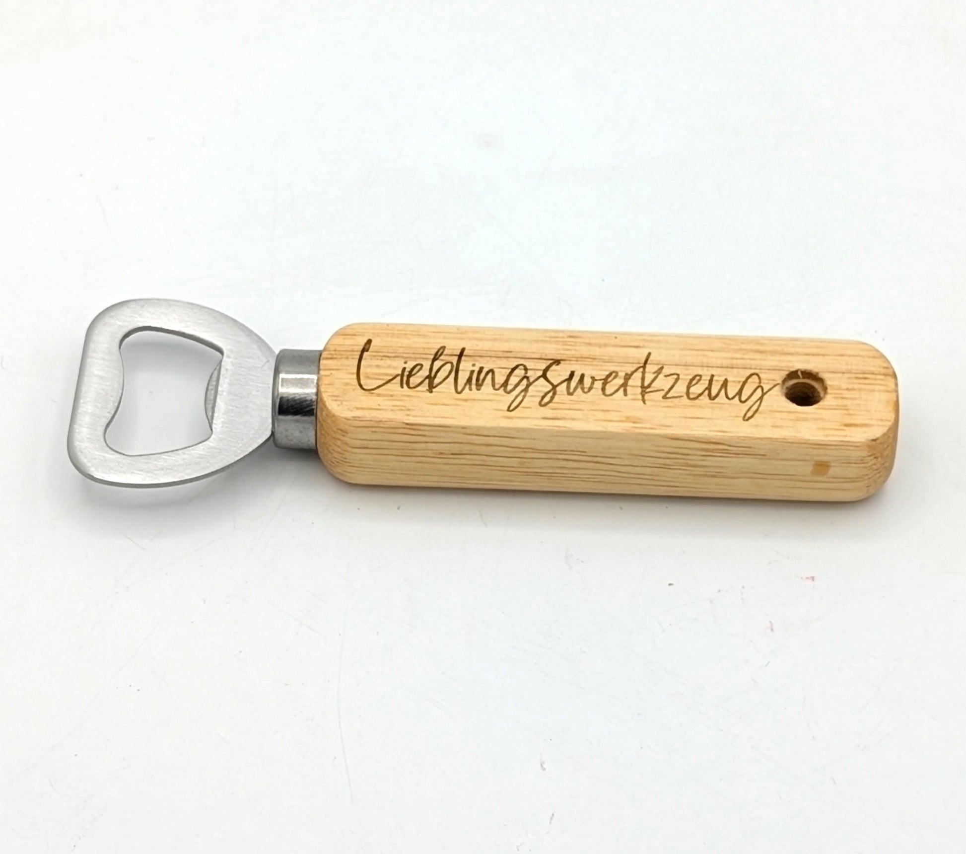 Flaschenöffner aus Buchen-Holz mit Lasergravur "Lieblingswerkzeug"