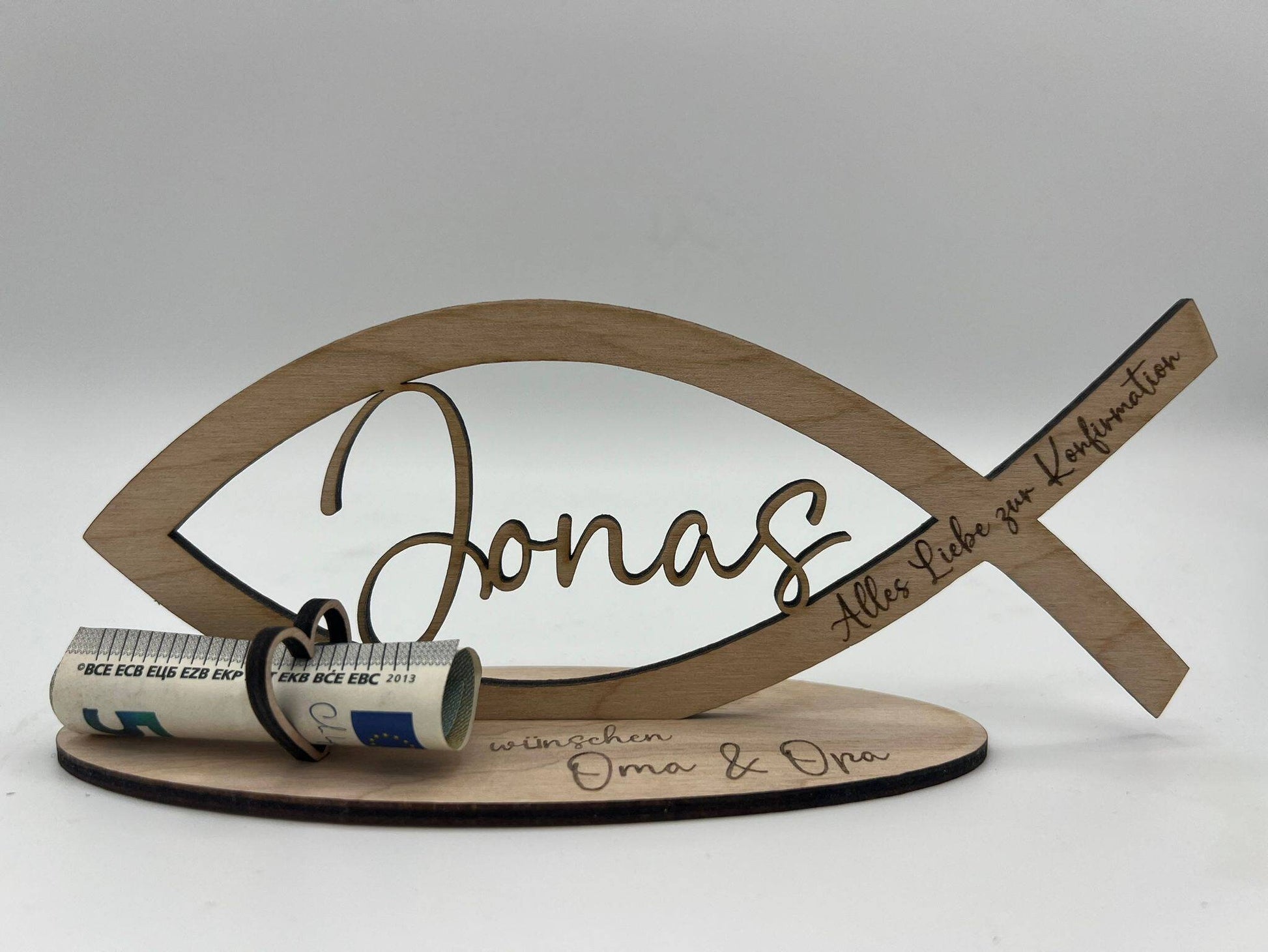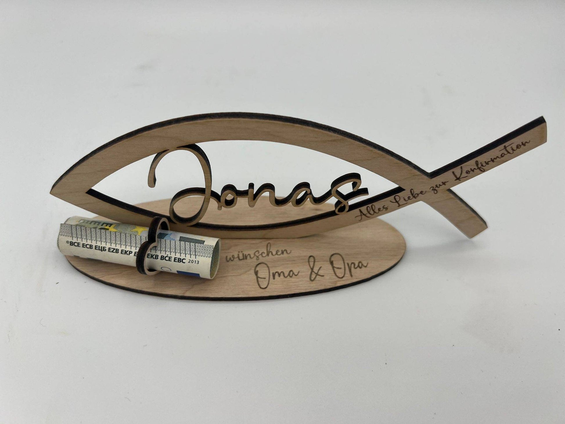 Personalisierter Holz-Fisch – Geldgeschenk zur Kommunion, Konfirmation oder Firmung 🐟✨